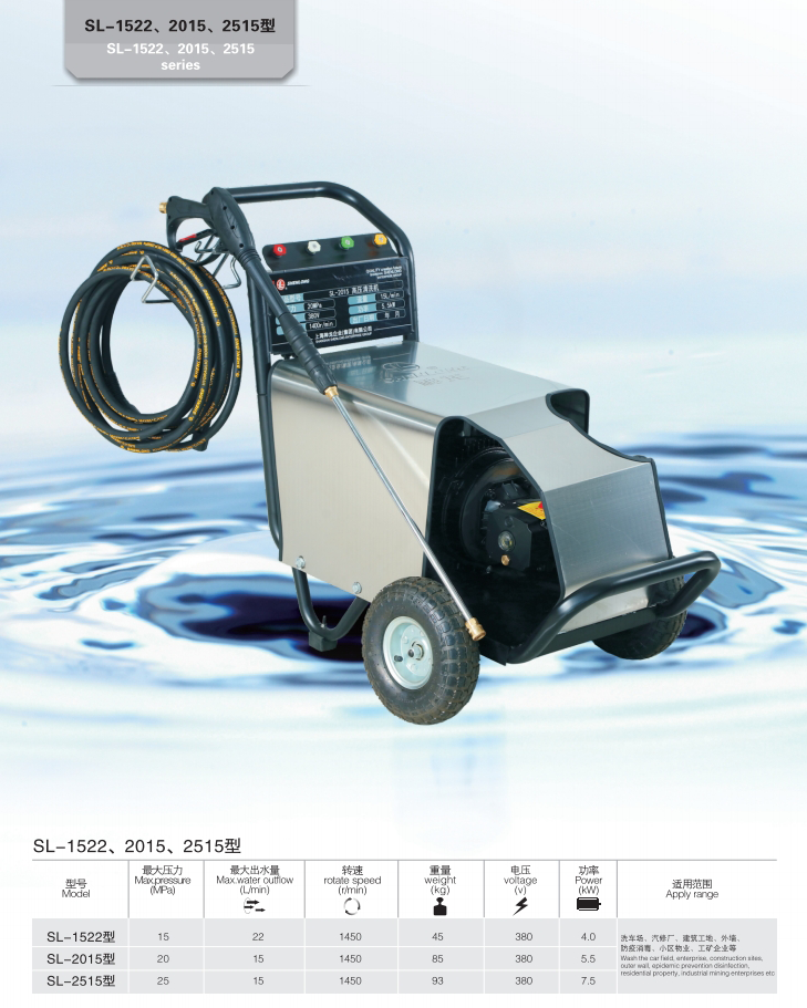 上海神龍集團生產(chǎn)的高壓清洗機SL-1522、2015、2515型高壓清洗機,適用洗車場、汽修廠、建筑工地、外墻、防疫消毒、小區(qū)物業(yè)、工礦企業(yè)等。